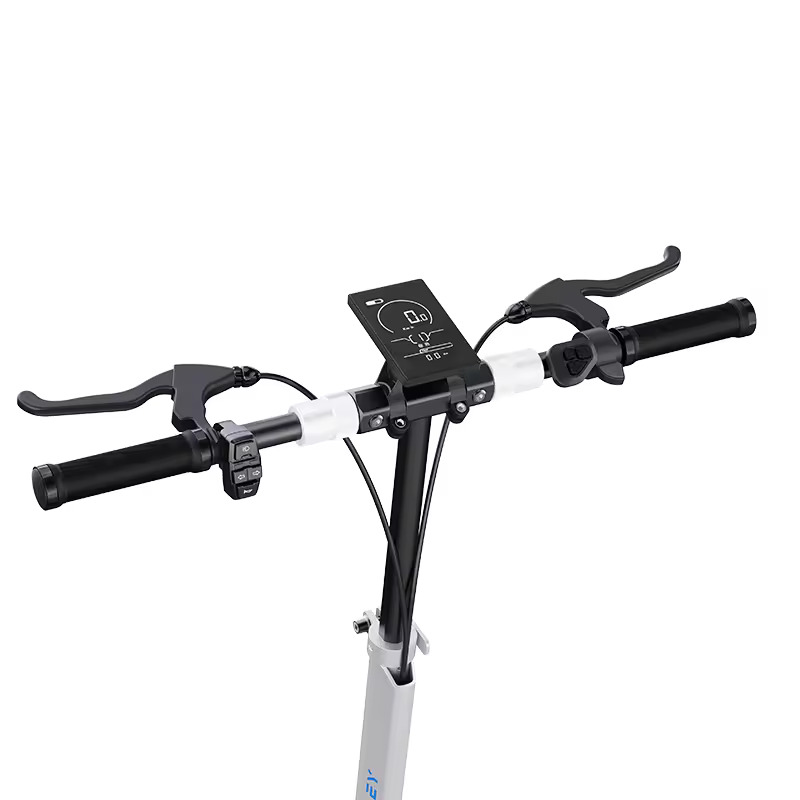 1. Kierownica hulajnogi elektrycznej OKULEY R8 DUAL wyposażona jest w umieszczony pośrodku panel przyrządów LCD wykonany z wytrzymałego szkła, który może wyświetlać podstawowe parametry hulajnogi elektrycznej, takie jak prędkość i przebieg. Po lewej stronie znajdują się przyciski klaksonu, światła centralnego i kierunkowskazów. Po prawej stronie znajduje się manetka gazu wskazującego oraz przyciski sterujące hulajnogą, za pomocą których możemy zmieniać biegi, włączać i wyłączać hulajnogę oraz włączać i wyłączać silnik.